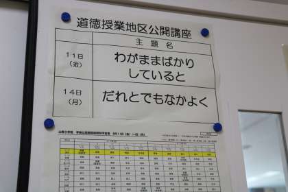 なお、本日そして月曜日も同様、今年度の道徳授業地区公開も兼ねております。各教室ドアには、道徳授業の主題名が掲示されています。今年度は、授業後の協議会や講演などは実施せず、道徳についてのご意見は「道徳授業地区公開講座にぜひご参加を」にご記入いただきます。ご参観いただいた道徳授業や子どもたちの様子について、またご参観いただけなくても日頃の道徳に関することなどについてご意見をお寄せいただきますよう、お願いいたします。