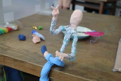 「見つけてワイヤードリーム」の制作の様子です。ワイヤー作った骨組みに、紙粘土に色を付けて肉付けしていきます。体の内側から作ったりどの部分に粘土が必要なのか不要なのか考えながら作ります。