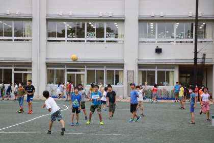 朝のロング遊び、月曜日は高学年が外遊び、低学年が内遊びです。曇り空で、まだ暑さが厳しくない中、元気に体を動かす高学年の様子です。