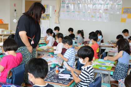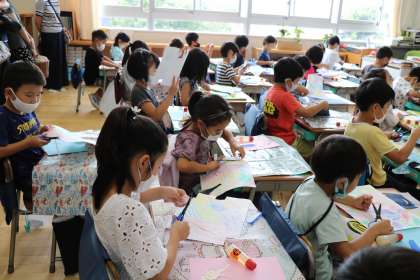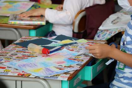 1年生図工「クレヨンやパスとなかよし」の学習の様子です。凸凹から形を見つけ、あれにぴったり!あれに似ているな、作ってみたいなあという気持ちで作品を作ります。