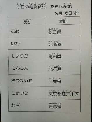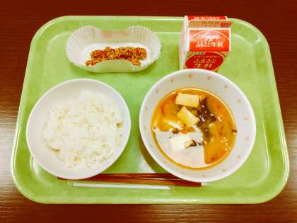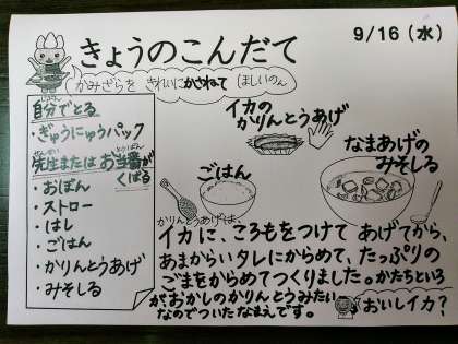 きょうは、ごはん、イカのかりんとうあげ、なまあげのみそ汁、ぎゅうにゅうです。