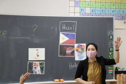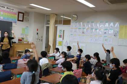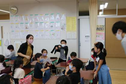 「何て言ってるのかな。」と、つぶやいていた子もだんだん慣れてきて、先生が何をたずねているのかが分かってきたようです。手を挙げて答えたり、友達に英語で尋ねたりできている子がたくさんいて、感心しました。
