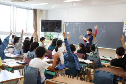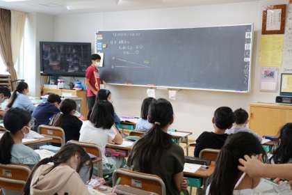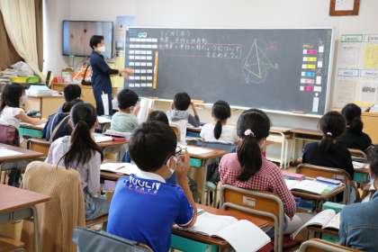 算数「垂直・平行と四角形」の学習です。今日は「垂直」についてです。平面における直線の垂直・平行は、2本の直線の位置関係を表しています。「身の回りにも垂直がある!」という子どもたち。教室の中を見回して、楽しそうです。