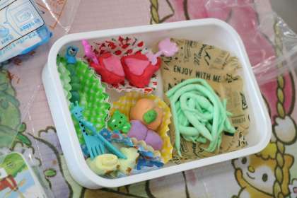 この緑のは、千切りキャベツ?と聞いたら「ジェノベーゼパスタ!」と。失礼しました。