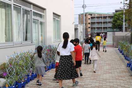 今朝は、今年度初めての交流活動です。今年度は全学年で1班ではなく、2学年の班を作り活動します。今朝はその1回目、1・6年生です。6年生が1年生を教室まで迎えに行き靴を履いて外に出ます。