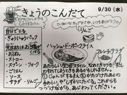 今日は、ハッシュ・ド・ポークライス、フレンチサラダ、りんご、牛乳です。