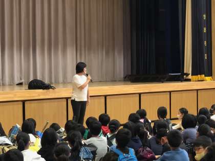 小雨が降っていたので体育館で出発式です。今日のテーマは、「自分以外の人のことを想う」です。班の友達、地域の方、信号待ちしている人、自転車に乗っている人、自分以外の色々な人のことを想い楽しい1日にしよう!という話をしました。真剣に聞く子どもたちです。