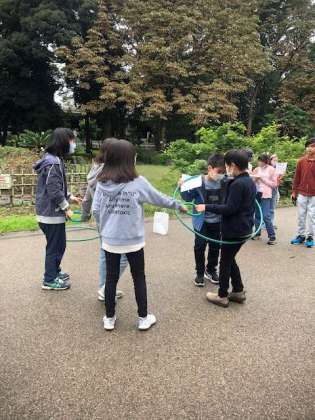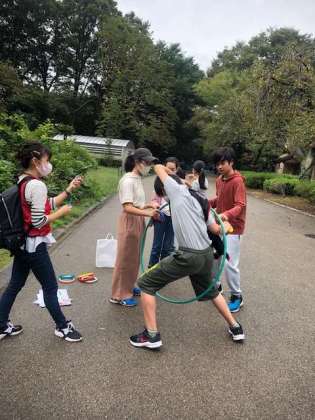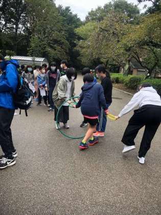 オリエンテーリング開始です。先生たち、サポーターの先生たちが色々なコーナーを企画しています。写真は輪くぐりのコーナーです。