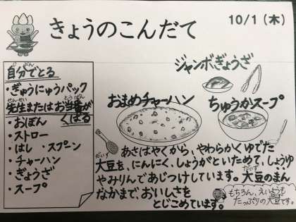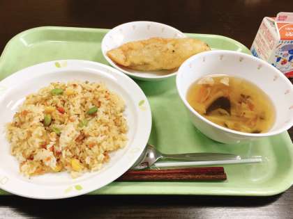 今日は、おまめチャーハン、ジャンボぎょうざ、中華スープ、牛乳です。