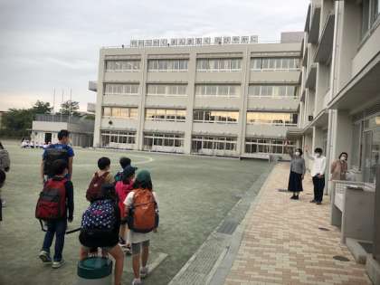 ?今日は5年生校外学習です。朝方の雨で、天気が心配でしたが、8時頃には曇り空に。出発式を済ませ元気に出発します。お見送りの先生方に「行ってきまーす」。