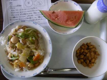 今日の献立 中華丼・牛乳・大豆とじゃこの甘辛揚げ・小玉スイカ