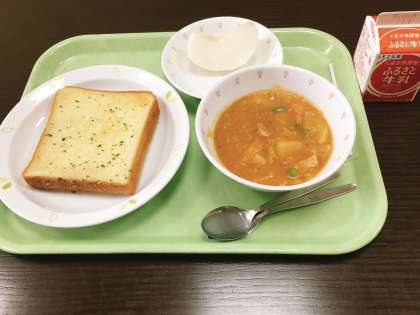 今日は、ガーリックトースト、ポークシチュー、なし、牛乳です。