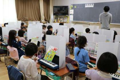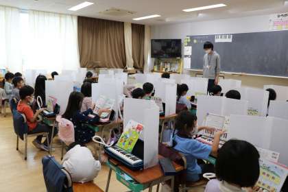 音楽、鍵盤ハーモニカの学習の様子です。感染予防のため、パーテーションを使ったり、鍵盤ハーモニカのお手入れは家でお願いしたり、今までとは違うことがたくさんありますが、子どもたちが大好きな楽器の演奏に変わりありません。