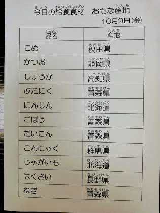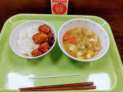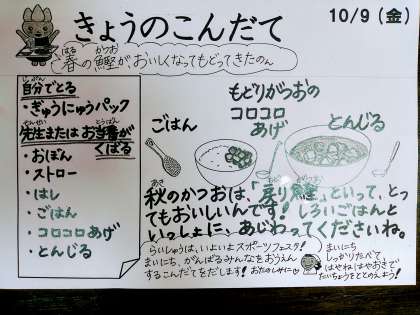 きょうは、ごはん、もどりがつおのコロコロあげ、とんじる、牛乳です。