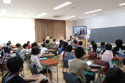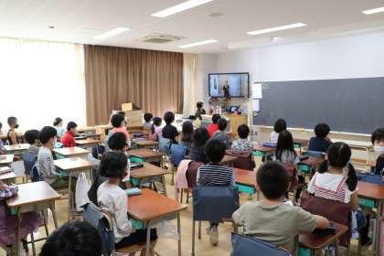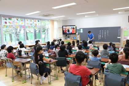教室ではテレビで開会式に参加です。