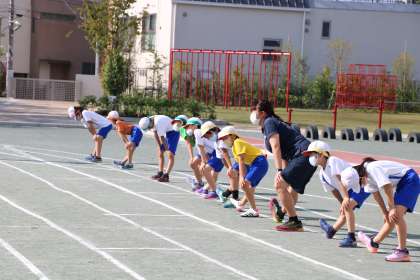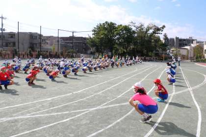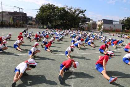 続いて準備運動です。担当の子どもたちが前に出て、全員で準備運動をします。