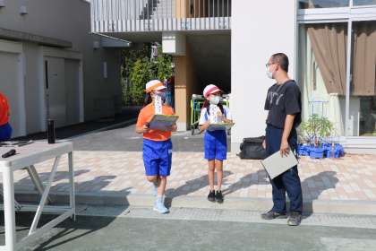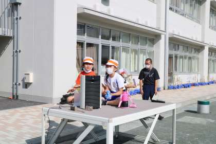 用具の準備・片付けは子どもたちでやります。朝礼台のところに「実況中継担当」と「音楽担当」の子どもたちも準備OKです。