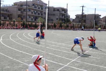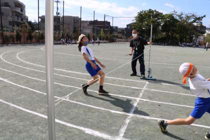 ゴムくぐりのポールが倒れないように、子どもたちがサッと出てきて押さえてくれます。みんなで協力。こんな場面でも、よく見て動ける3年生の姿に成長を感じます。