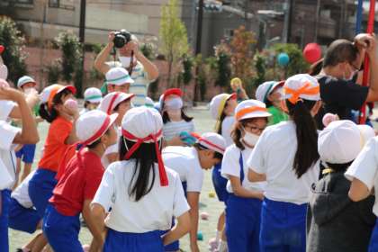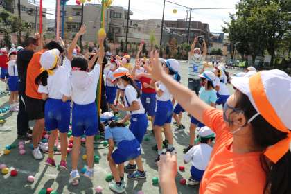 友だちに分けてもらったり、自分で探したり。かごを押さえる先生たちも必死です。