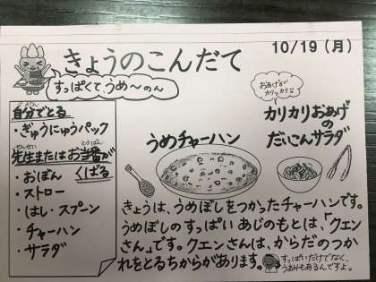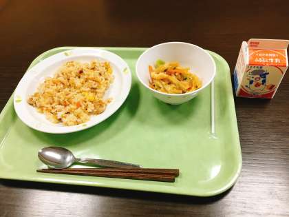今日は、うめチャーハン、カリカリお揚げの大根サラダ、牛乳です。