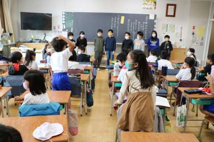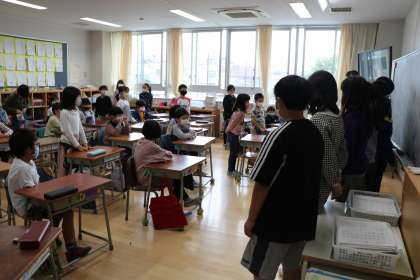 明日の朝は2・5年生の交流班活動があります。今日は、その顔合わせということで、5年生が2年生の教室へ行き、あいさつや自己紹介をしてきます。「私が〜君の担当です。」というと、2年生が立って「僕が〜です。よろしくお願いします。」とあいさつしています。
