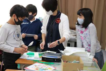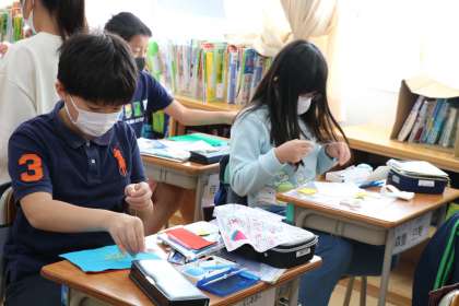 フェルト布を使って、小物づくりの様子です。紙で型紙を作って、布を切るところから始めます。自分のアイディアを生かした、ペンケース、ストラップ、ティッシュ入れ、小物入れなど様々な作品があります。