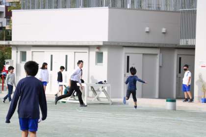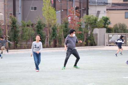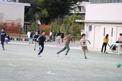 今日の朝は、朝学習の日ですが、2・5年生は交流活動の日と予定を入れ替えました。工程では5年生が、第2グランドでは2年生が遊んでいます。校庭でのびのび遊ぶ5年生(と、担任)の様子です。