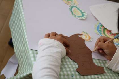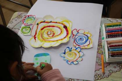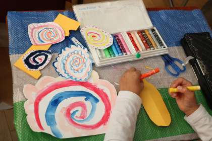 「ぐるぐるの花」の作品作りの様子です。絵具で書いたぐるぐるの花を切りました。次はレイアウトを考えながら、どんな花瓶にしようかな、どうやって花瓶に生けようかなと考えます。素敵な花瓶や花束ができそうです。
