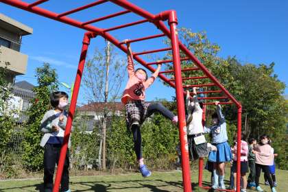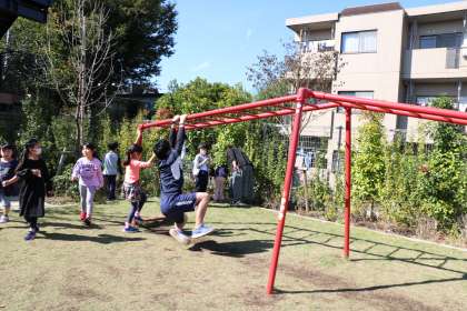 うんていを応援してくれていた先生が、おもしろいやり方も教えてくれます。遊具はいつも大人気です。