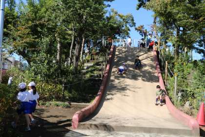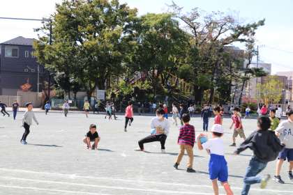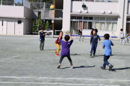 身体を動かすことが気持ちのいい一日です。校庭では先生も一緒に遊びます。