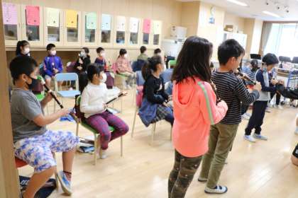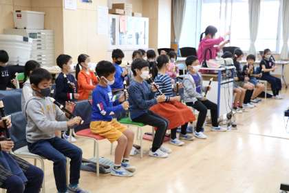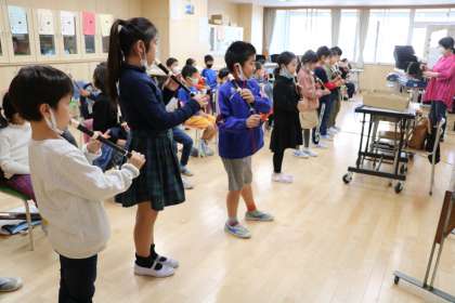 リコーダーの指遣いを学習しています。実際に音を出すときは、列ごとに一番前に出てきて吹きます。