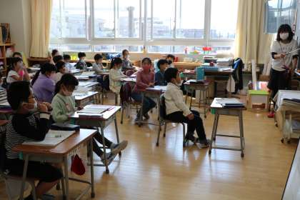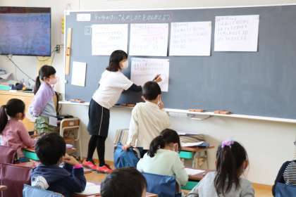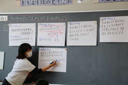 算数の学習の様子です。算数は計算の仕方を考え、おはじき、図、絵、言葉いろいろな方法で説明をすることで、確かな力となります。友だちのやり方をいろいろ聞くのも大切な学習です。