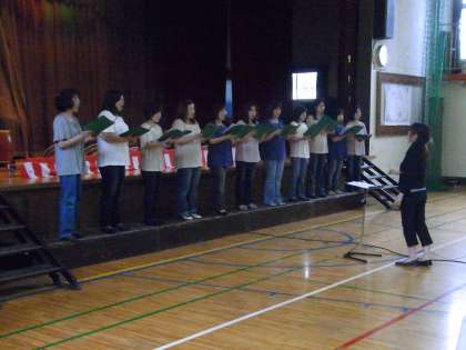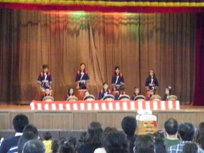 学校運営委員会主催で、震災復興支援のためのチャリティーコンサートが行われました。中谷委員長の開会のあいさつに続き、トップバッターはPTAコーラスの皆さんです。美しい歌声が心に響きます。心がじわーっと温かくなりました。次は、山野太鼓のみんなです。毎週土曜日練習を積み重ねています。小気味いいリズムが、ずんずんお腹に伝わってきました。