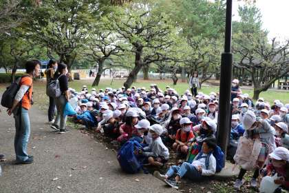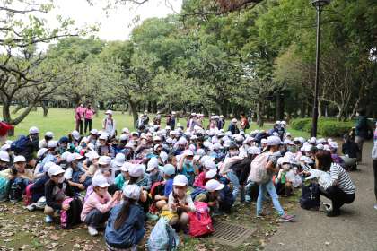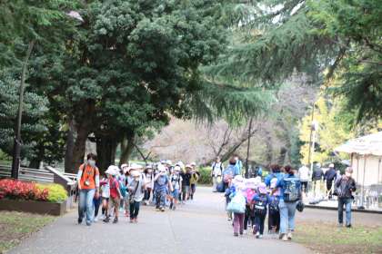 砧公園に到着です。園内で他の保育園・幼稚園の子も遠足に来ています。すれ違う時元気にあいさつする山野小学校の子どもたちです。