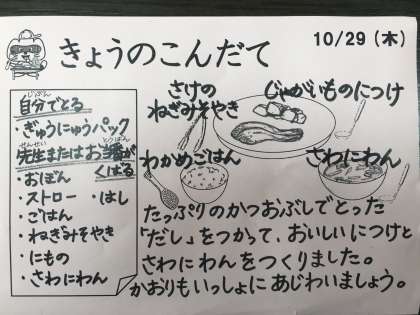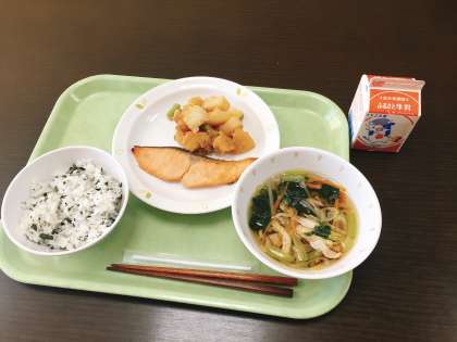 今日は、わかめごはん、鮭のねぎみそ焼き、じゃがいもの煮つけ、沢煮わん、牛乳です。