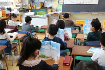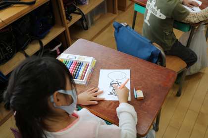 「くじらぐも」の学習です。くじらぐもを見つけた1年生が、くじらぐもに向かってなんて話しかけるかな?と、セリフを想像します。自分が物語の中に出てくる1年生なら…と考え、いろいろなセリフを書いています。