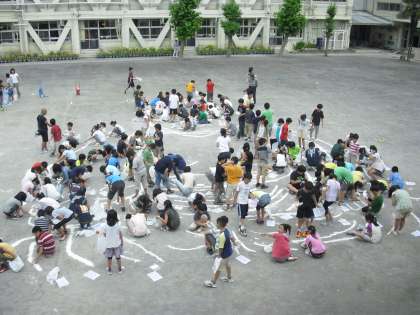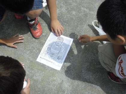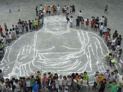 6年生が、校庭に実寸大の大仏(奈良)を描きました。全長15m、全幅12mの巨大絵画の完成?!6年生のみならず、他の学年の子ども達も興味津々。平和への願いを込めて!