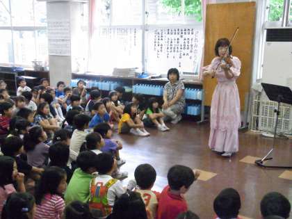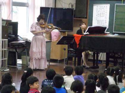 山野小学校では、地域の方をゲストティーチャーにお呼びして様々な教育活動を実施していますが、今日は1年生の音楽の授業に地域にお住まいのプロのバイオリニストをお呼びして、ミニ演奏会を開きました。初めて生のバイオリンの演奏を聴く子がほとんどで、子どもたちは興奮状態。でも、演奏会では静かに目と、耳と、心で聴くということを教えていただき、だんだんと聞き方も上手になってきました。本当に、素晴らしいバイオリンの音色で、心にその響きがしびれるように伝わってきました。途中で、バイオリンと一緒に校歌を歌ったり、トトロの歌を歌ったりして、大満足です。原先生、本当にありがとうございました。ピアノ伴奏をした梶先生も、ありがとうございました。