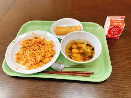 今日は、キムチチャーハン、春巻、豆腐とわかめのスープ、牛乳です。
