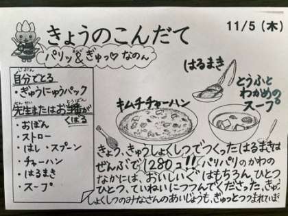 今日の春巻は、中華だけど皮がフランス風というか、パリパリで、とても美味しいです。キムチチャーハンも調理していただいた給食室の方々の、優しいきむちが伝わってくる味でした。