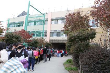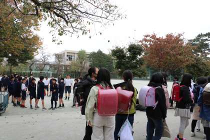 給食を早めに食べて砧中学校へ出発します。砧中学校へは砧小学校、明正小学校もいっしょです。