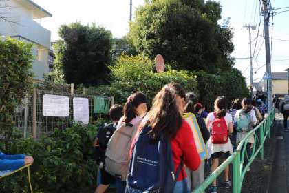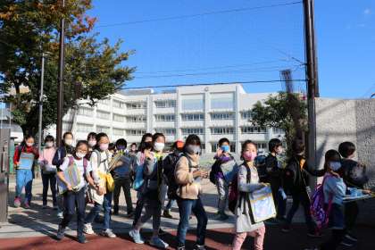 「いってきまーす」と、校庭を出るところまでは元気いっぱい。