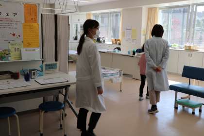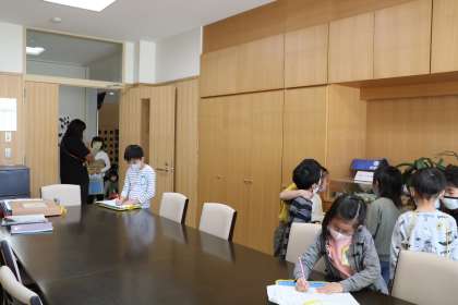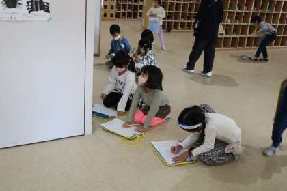 「しらせたいな、みせたいな」の学習の様子です。学校の中の知らせたいもののところに行き、絵をかいたりメモをしたりしています。保健室に行ったり、山のの山に行ったり、ウサギを見たりそれぞれが見たいところに出かけています。校長室でも、一生懸命見ては絵やメモを書いています。