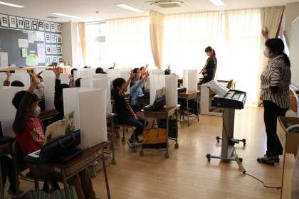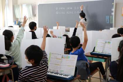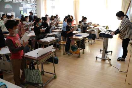 指遣いを全員で確認しながら鍵盤ハーモニカの学習です。難しいところもありますが、指遣いがきちんとできると途切れずきれいなメロディーを演奏できます。