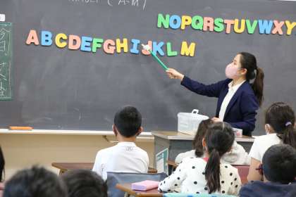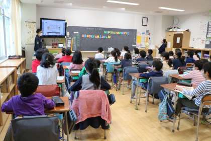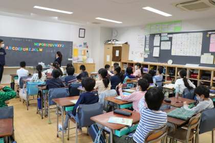 アルファベットの歌を練習しています。今までの数字の歌の替え歌です。アルファベットでもぴったりおさまって歌えることに子どもたちは感激している様子です。