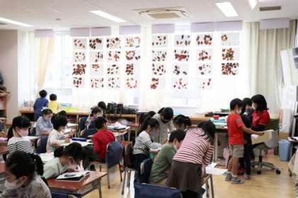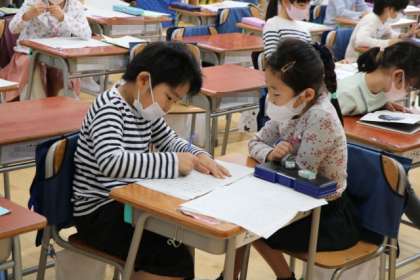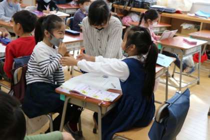 「しらせたいなみせたいな」の、書く学習仕上げの時間です。友だちも協力して学習している温かい雰囲気に、心がほっこりします。