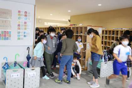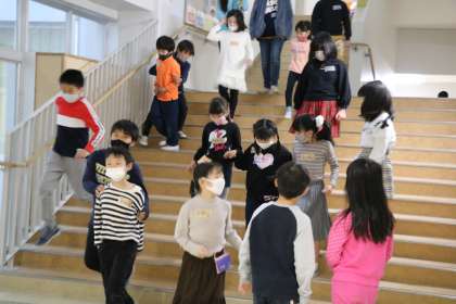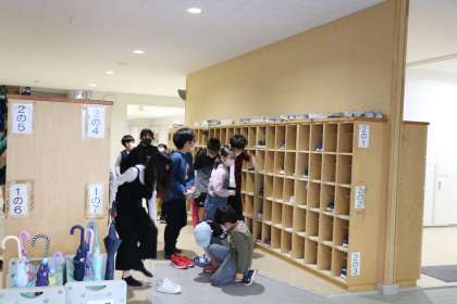 5年生の靴箱は2年生と違う昇降口なので、2年生を迎えに行くとき自分の靴をもっていきます。5年生の上履きは靴箱の上に置き、2年生の靴箱のある昇降口から一緒に校庭に出ます。そんな細やかな配慮はさすが5年生です。