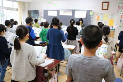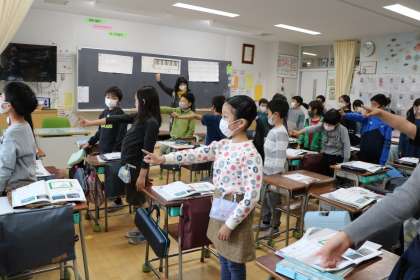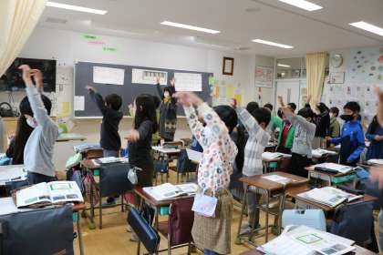歌「ふじ山」の学習の様子です。「曲の山」を意識して歌うために、手振り身振りを付けて歌います。