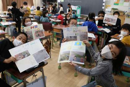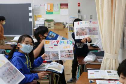 「世界の国を調べよう」の学習の様子です。図書資料で調べたことをしっかり読みこみ、大切なことを選び出し、発表用のフリップや発表原稿を仕上げています。
