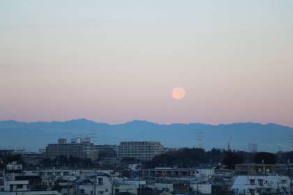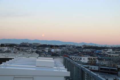 写真はいつもの屋上から、朝行く月と小田急線です。